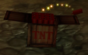 Bang Boxes are enemies found in Glitter Gulch Mine in Banjo-Tooie. When Banjo and Kazooie get close, a Bang Box will immediately open itself up and start lobbing sticks of dynamite at them. These baddies are somewhat more stable than some other explosive enemies such as Shrapnel and Boom Box, so merely touching one will not cause it to explode. However, a direct attack will be more than enough to set it off, costing the bear and bird two honeycombs if they get caught in the blast.