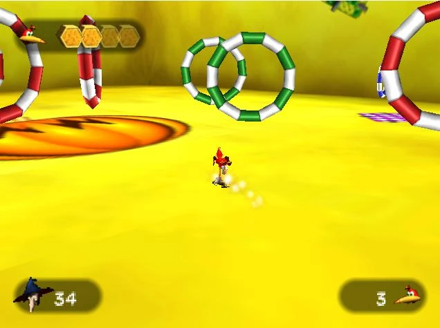 Kazooie will have 60 seconds in which to score 30 points by running through different size and colored hoops. Red hoops are the largest and are worth only one point. Green hoops are medium-sized and are worth two points. Blue hoops are the smallest and are worth three points. Kazooie may or may not use the Running Shoes located in the middle of the room.
