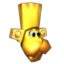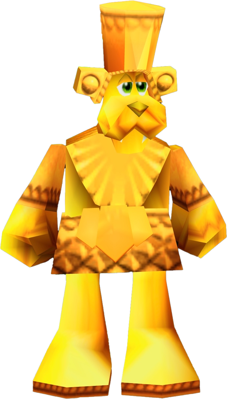 The Golden Goliath is a large, golden statue of an anthropomorphized tiger found in Mayahem Temple. He remains dormant and buried in the ground with only his head visible until Mumbo Jumbo casts the Summon spell on him, rising him up and giving control of his body to the player for seventy five seconds. During this time, the Golden Goliath can wade through quicksand to collect treasures and has a kicking attack which is powerful enough to blow open large stone doors, bust boulders, and completely demolish Sput Sputs (who respawn when the Goliath is returned to his plinth). The Golden Goliath is only required to open the stone doors and get a certain Jiggy, although he can destroy objects that could otherwise only be destroyed with the Bill Drill and Grenade Eggs. He also has a rather limited jump, which isn't of much use, but is impervious to damage. Most enemies will run around in fear when the Golden Goliath moves around.