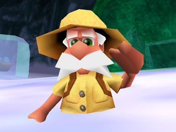 Sabreman's appearance in Banjo-Tooie was not much more than as a minor character. Banjo and Kazooie discover his frozen body on the icy side of Hailfire Peaks clutching a familiar-shaped treasure. But just trying to heat up his frozen self will not work because he is dead. The first step in rescuing this lost explorer is to use Mumbo Jumbo to bring him back to life; however, this still leaves poor Sabreman cold in the snow, requiring you to heat him up with Fire Eggs, Hatch or Dragon Kazooie. Then Banjo must use the Taxi Pack to bring him back to the fire side of Hailfire Peaks. Once all is done and well, Sabreman will give the pair a Jiggy that he had stashed in his tent and hit the hay, where he sleeps perpetually for the remainder of the game.